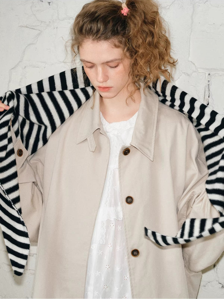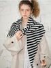 Elevate your winter layering with this oversized triangle scarf. Crafted from 100% wool, this versatile accessory features a bold black and white striped pattern. Its generous dimensions allow it to be draped as a shawl or wrapped closely as a warm neck scarf, making it an essential piece for cold weather styling.