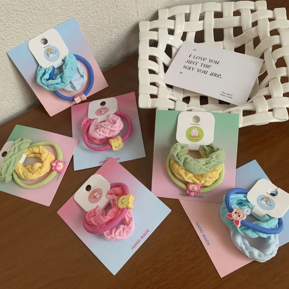 Add a pop of playful charm to any hairstyle with this adorable 2-piece hair tie set. Designed for comfort and style, this set includes one plush, mini terry-cloth scrunchie and one matching high-stretch elastic, both in sweet, coordinating pastel colors. The set is finished with a tiny, cute cartoon charm for that extra touch of "kidcore" fun. At an incredibly lightweight 8g, this duo is perfect for pigtails, braids, or half-up styles, providing a gentle, no-snag hold that's comfortable all day long.