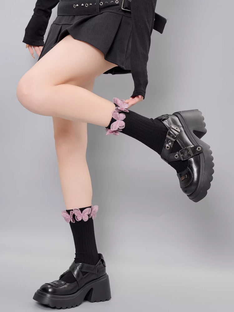 Embrace the warm autumn aesthetic with these charming brown crew socks. Characterized by the popular "Maillard" color palette (earthy coffee tones), these socks feature delicate ruffled cuffs adorned with exquisite 3D embroidered butterflies. Crafted from soft cotton, they offer a comfortable fit while adding a fairy-tale touch to your loafers or Mary Janes.