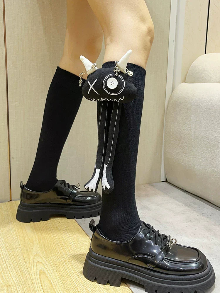 Add a playful touch to your wardrobe with these novelty knee-high socks. Featuring a unique 3D cartoon monster plush attachment with a button eye detail, these socks combine quirky style with comfort. The ribbed knit construction ensures a secure fit, making them suitable for casual wear or costume styling.