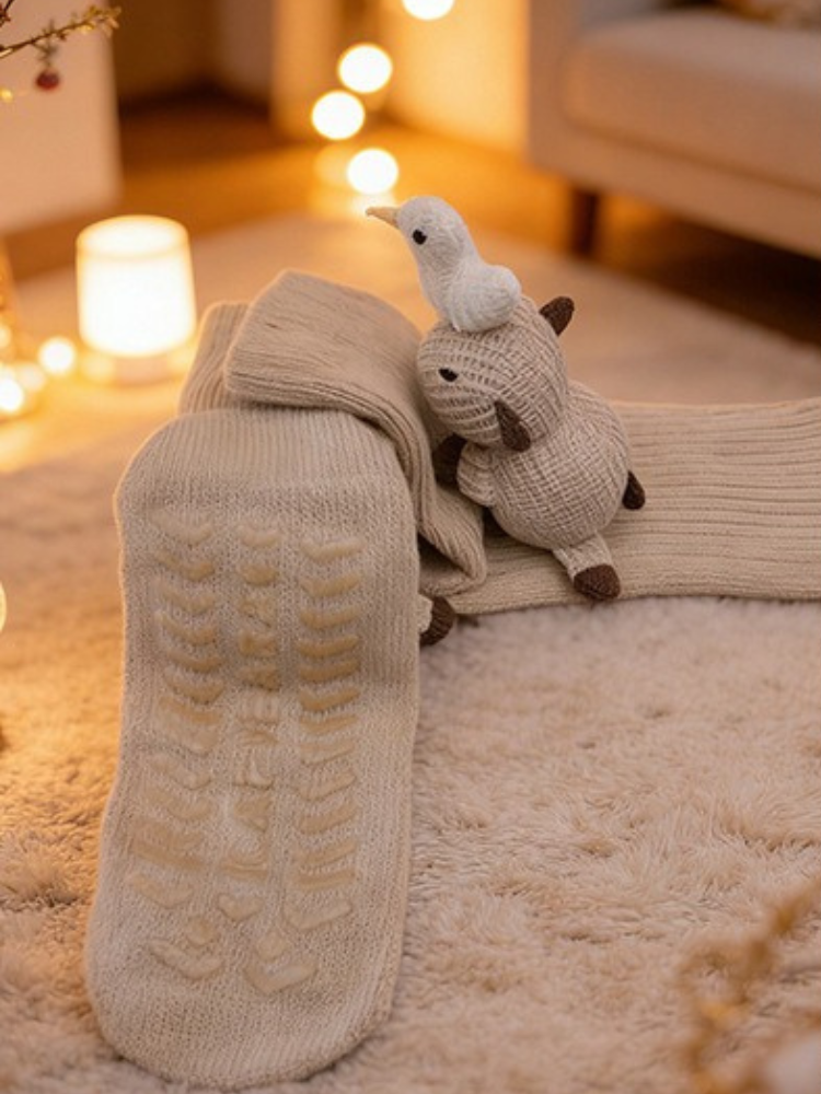 These adorable floor socks feature a whimsical 3D crochet design of a brown Capybara carrying a small white bird on its head. Crafted in a warm beige ribbed knit, the socks are finished with color-coordinated non-slip grippers on the sole, making them perfect for safe and cozy indoor wear.