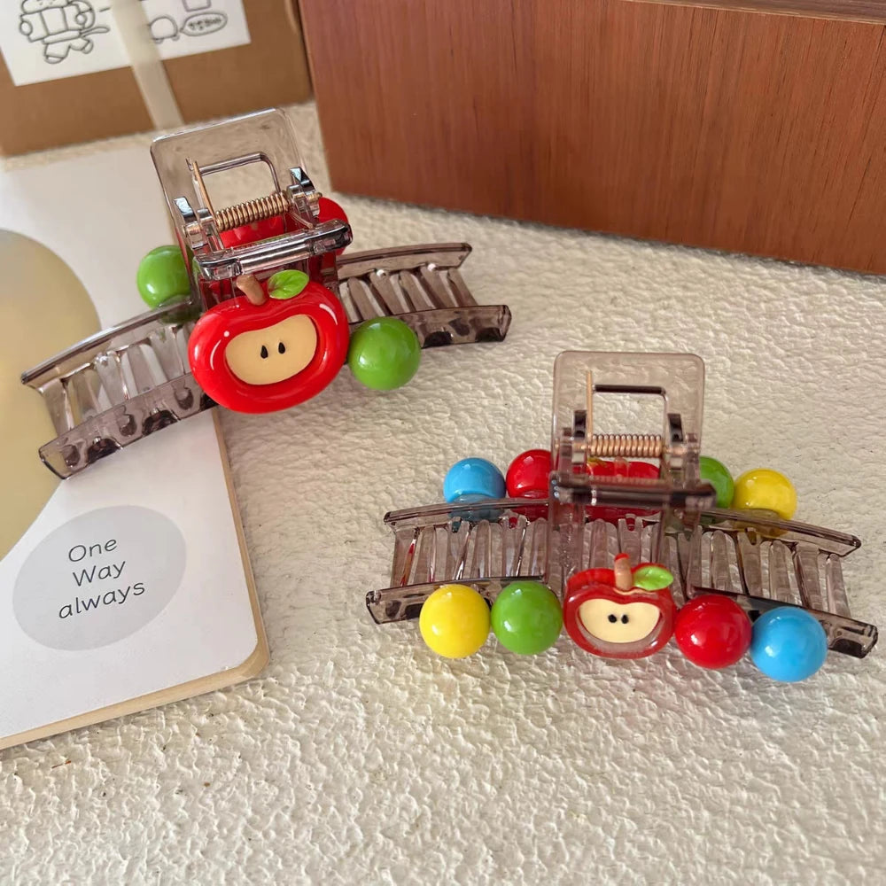 Add a sweet, playful pop of color to your look! This cheerful hair claw is designed to spark joy, featuring a whimsical smiling apple and vibrant, glossy 'candy-like' beads. Set on a modern, transparent smoke-gray base, this clip captures the fun-loving spirit of Y2K style. Its long 5.1-inch rectangular design provides a surprisingly strong and comfortable hold, making it perfect for securing a half-up style or sweeping your hair back with a touch of personality.