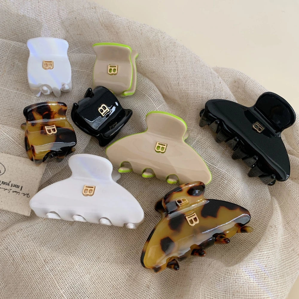 Crafted from high-gloss, premium cellulose acetate, each clip is adorned with a polished gold-tone "B" monogram. It’s an effortless way to elevate your hairstyle, whether you're securing a high ponytail, styling a chic half-up look, or simply accenting a low bun. Available in two versatile sizes to meet all your styling needs.