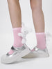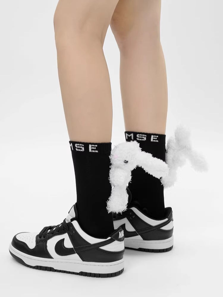 Step into a world of playful fashion with these black mid-calf socks featuring an adorable 3D fluffy white bunny. These socks are designed with a sporty yet cute aesthetic, highlighted by white "MSE" lettering embroidered on the ribbed cuff. Made from a soft cotton blend, they provide a comfortable, breathable fit suitable for all seasons, making them a perfect statement piece for streetwear or "kawaii" inspired outfits.