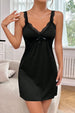 The dress is crafted from smooth, lightweight satin that feels silky against the skin. Unlike standard slip dresses, this piece features beautiful floral lace shoulder straps that continue down the back, adding a touch of texture and elegance. A delicate satin bow sits at the center of the V-neckline, finishing the look with a sweet feminine touch. With its mini length and figure-skimming fit, it's perfect for hot summer nights or layering under a robe.