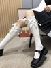 Channel your inner coquette or dark academia aesthetic with these charming black knee-high socks. Featuring a cluster of three satin ribbon bows adorned at the cuff, these socks add a sweet, preppy touch to any outfit. Designed with a longer 35cm tube length, they offer excellent coverage and a slouch-resistant fit, perfect for pairing with Mary Janes or loafers.
