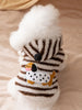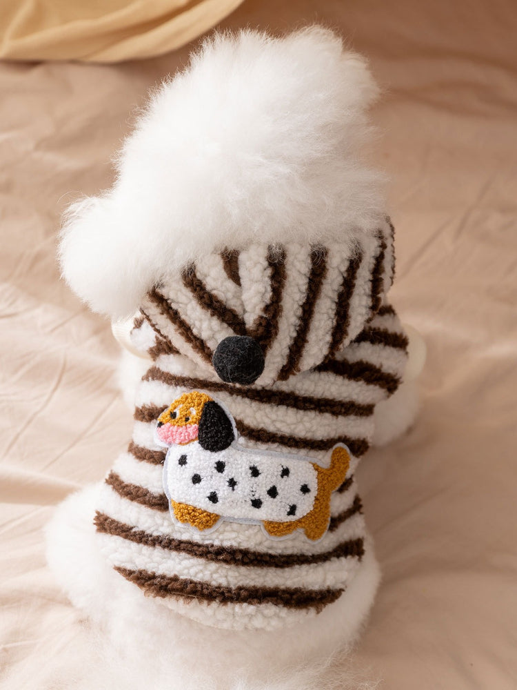 Keep your pet cozy and cute with this vibrant striped fleece hoodie. Made from soft sherpa-style fabric in a cheerful blue and red colorway, this winter coat features a playful dachshund embroidery on the back. The hood is topped with a red pom-pom, adding a festive touch to your dog's daily walks.