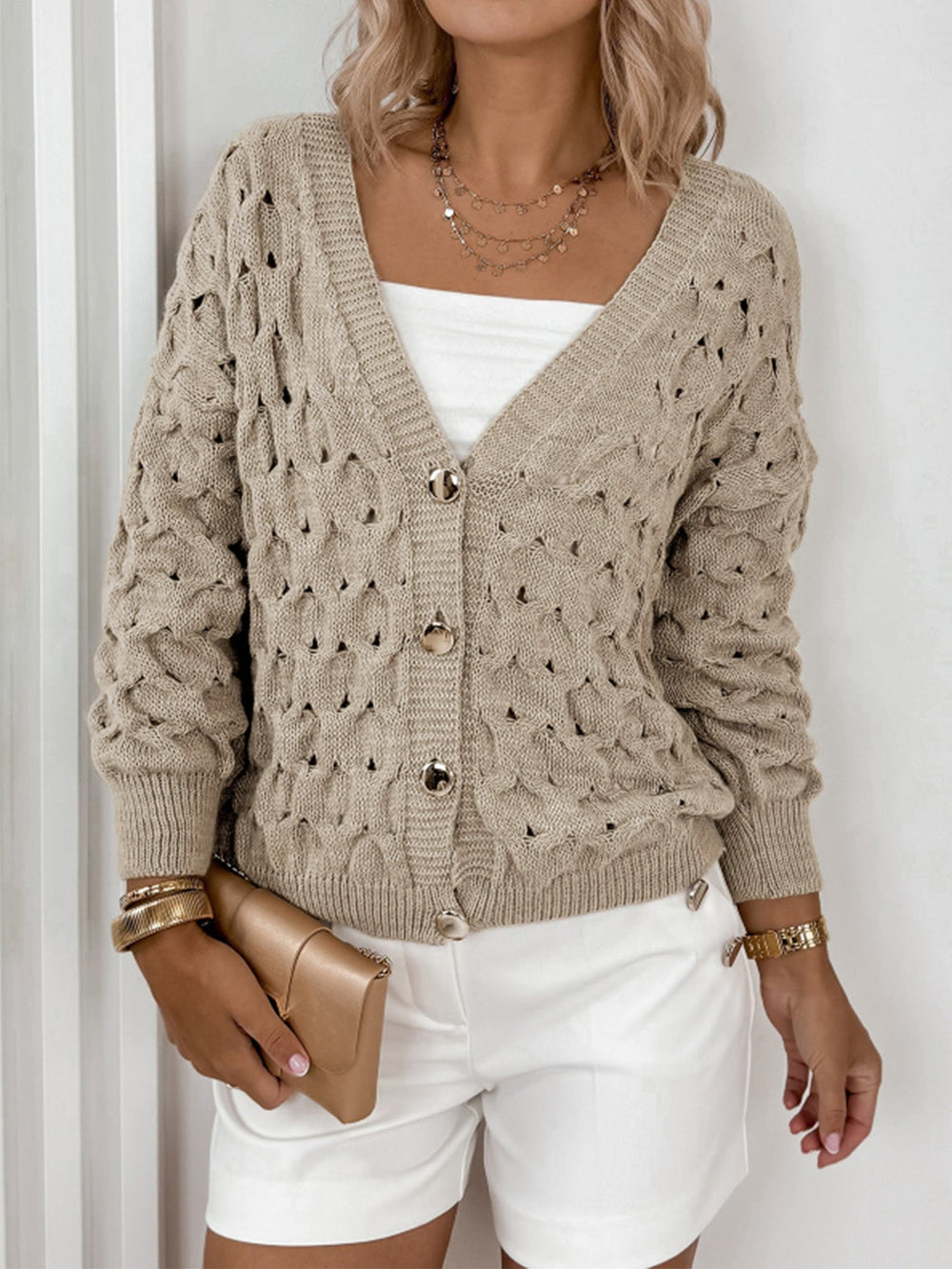 Elevate your layering game with our Boho Chic Hollow Out Knit Cardigan. This piece beautifully marries the relaxed, free-spirited vibe of open-knit textures with the polished sophistication of the "Old Money" aesthetic. The intricate honeycomb-style hollow-out stitching provides a breathable yet cozy feel, making it an ideal transitional piece for breezy spring days or cool autumn evenings.