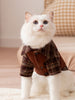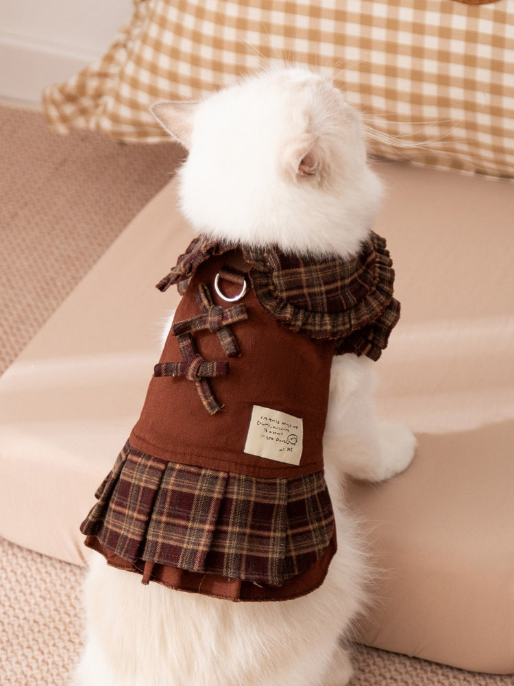 Embrace the trending "Maillard" aesthetic with this preppy academy-style pet apparel collection. Available in two matching styles—a pleated dress and a collared shirt—this outfit features a rich brown bodice contrasted with classic vintage plaid accents. Perfect for keeping your cat or small dog warm and stylish during the autumn and winter months.