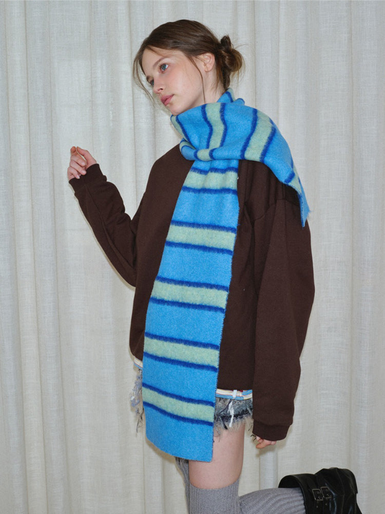 Add a pop of color to your winter layers with this Korean-style striped scarf. Featuring a bold blue and navy color-block design, this neck warmer is crafted with a special "brushed" technique that creates a fuzzy, soft texture similar to mohair. Its compact size (160cm x 19cm) makes it easy to tie neatly without bulk, perfect for daily casual wear.