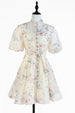 Crystal Embellishment, High Neck, Short Puff Sleeves, Side pockets, Tied Waist, All-over Floral Print, Mini Length.