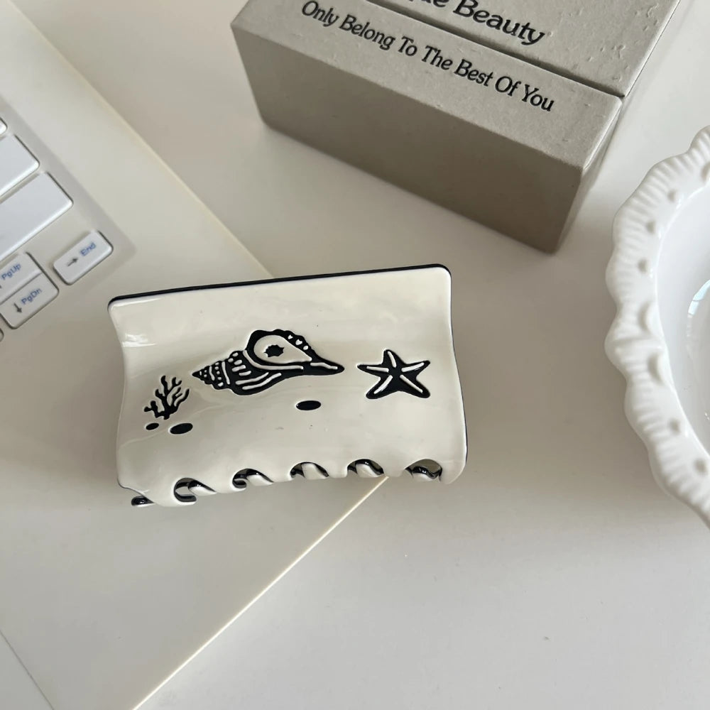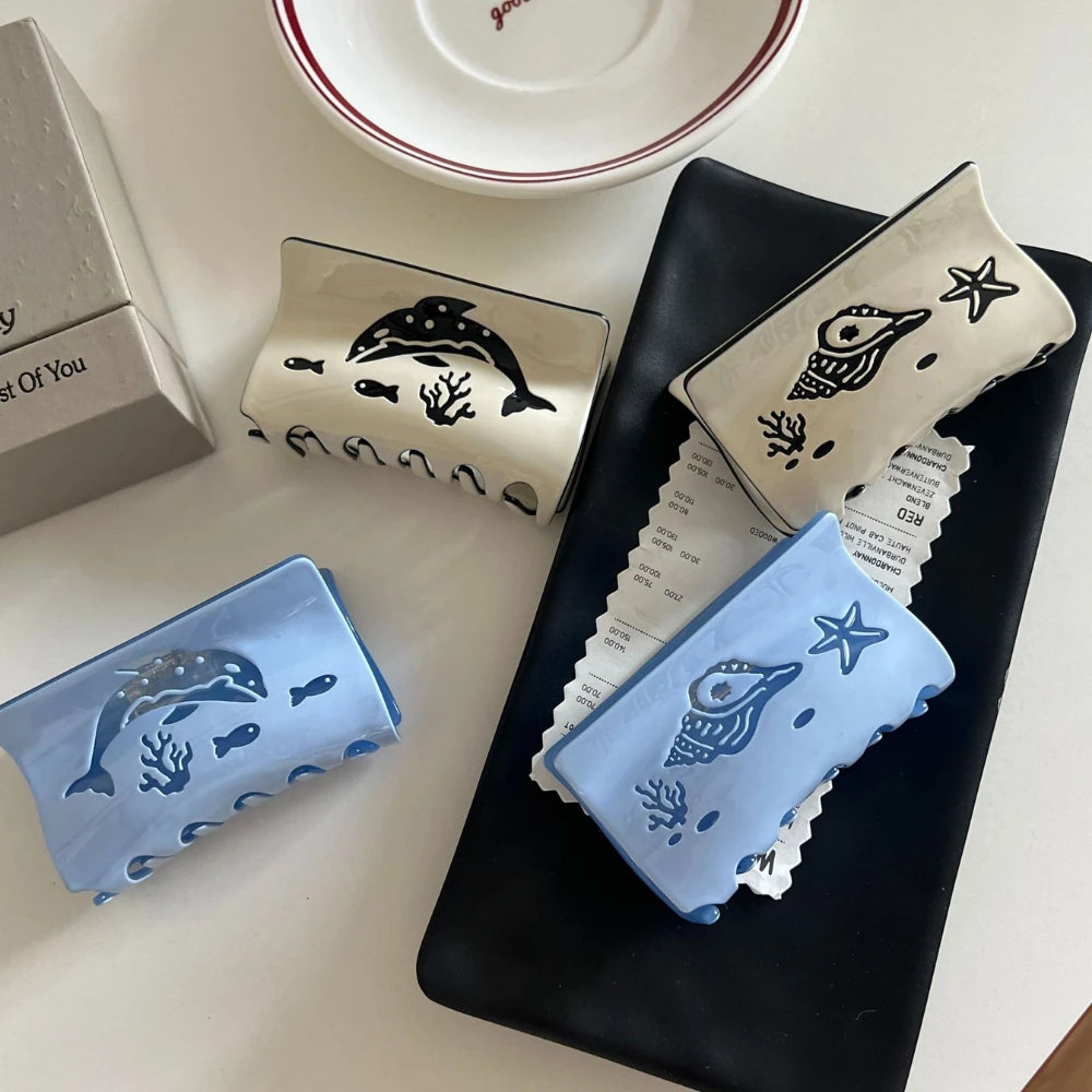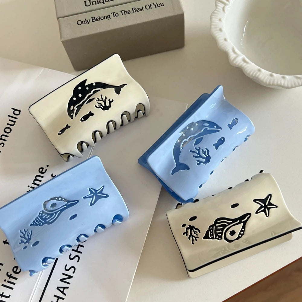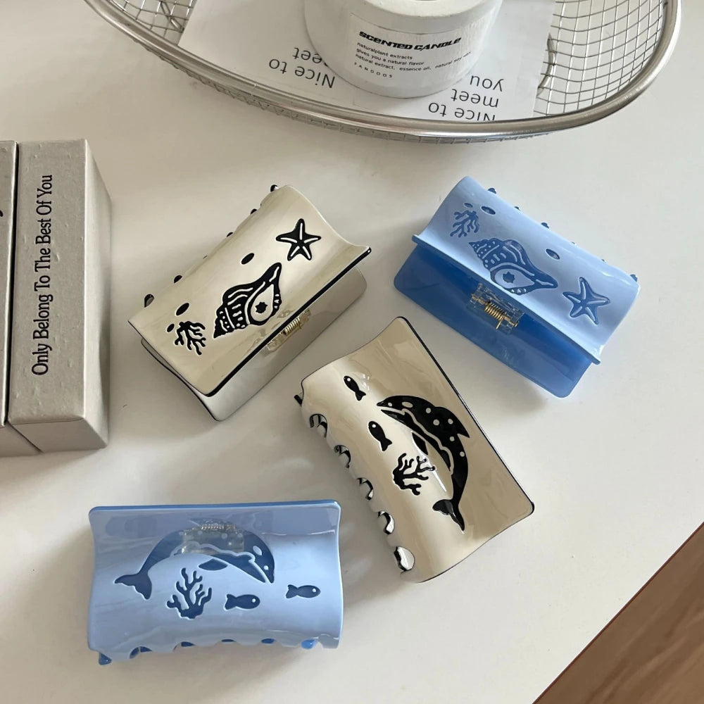 A touch of the ocean, captured in polished acetate. This beautifully crafted clip moves beyond simple prints, featuring an intricate, carved design that adds a layer of subtle, sophisticated texture. The minimalist marine motifs—a graceful dolphin or a classic seashell—are elegantly etched into the high-gloss acetate. It's the perfect accessory for the woman who appreciates quiet luxury and timeless coastal charm, offering a secure hold for a chic half-updo or bun.