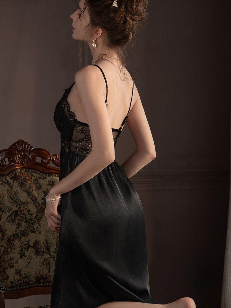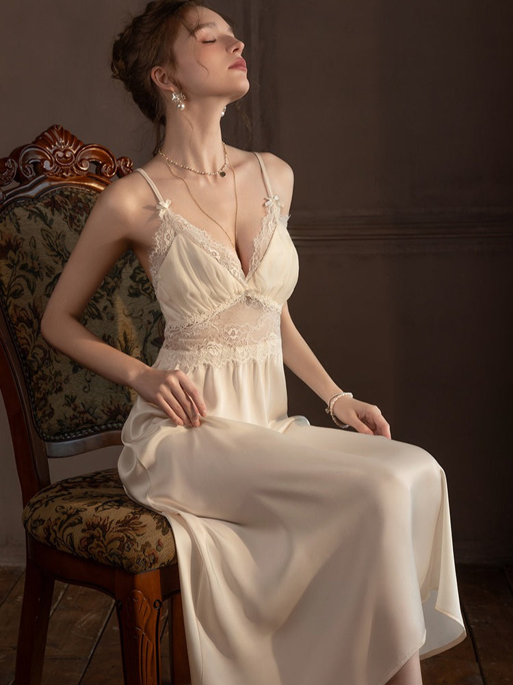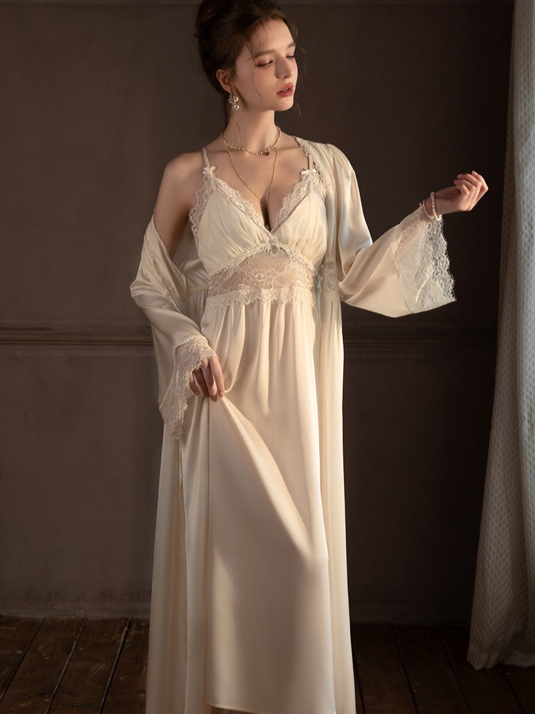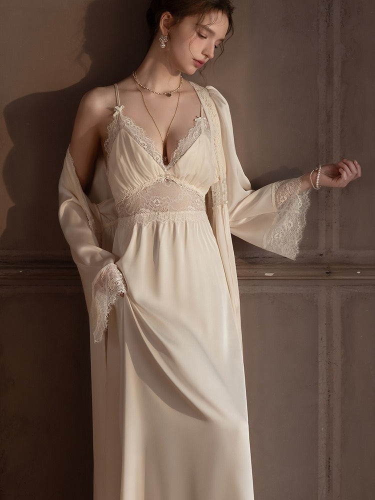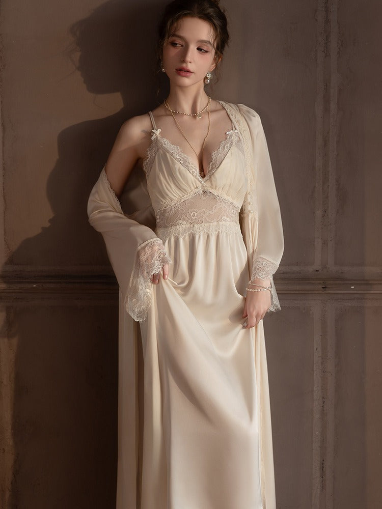 Wrap yourself in the luxurious embrace of our Vintage Champagne Lace Sleepwear Set. This exquisite two-piece ensemble evokes the golden age of Hollywood glamour, featuring a floor-sweeping silhouette and delicate lace details that define the "Old Money" aesthetic.