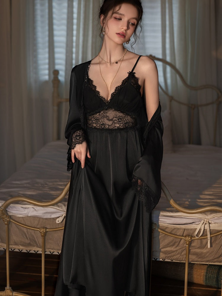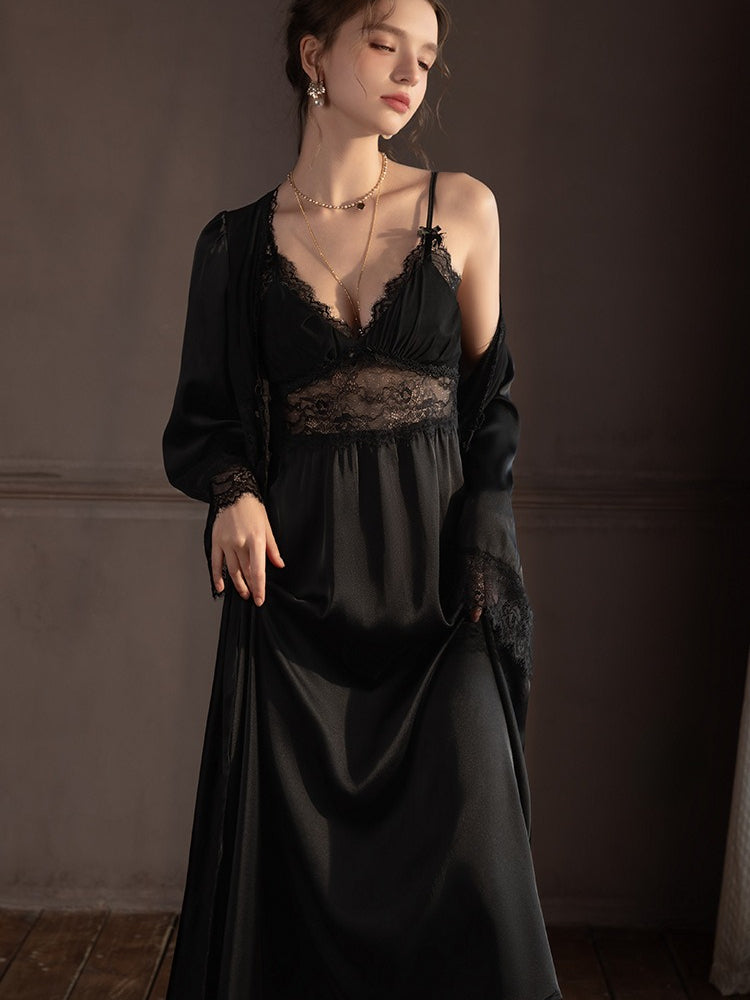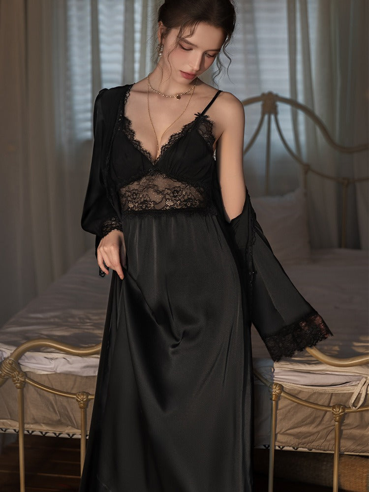 The centerpiece is a maxi-length slip dress with a romantic sheer lace midriff that accentuates your waistline while offering a tantalizing glimpse of skin. Designed for ultimate comfort and support, it includes built-in chest pads, allowing you to relax freely without a bra. Completed by a matching long satin robe featuring intricate lace cuffs, this set is perfect for honeymoon mornings, bridal parties, or simply elevating your evening routine.