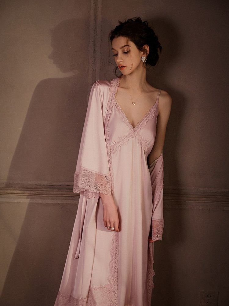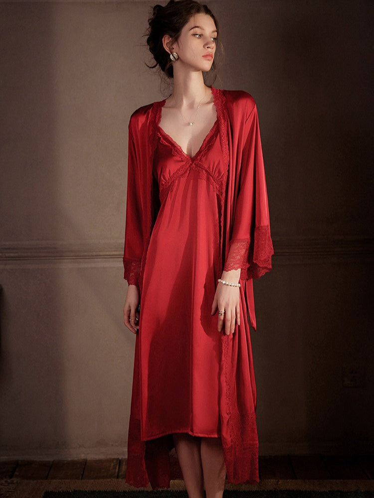 Crafted from premium "Ice Silk" satin that feels cool and fluid against the skin, the slip dress features delicate floral lace trimming and a flattering midi length. The integrated chest pads offer gentle support, allowing you to go braless with confidence. Drape the matching robe over your shoulders for a look that screams "main character energy" while you lounge, read, or enjoy your morning coffee.