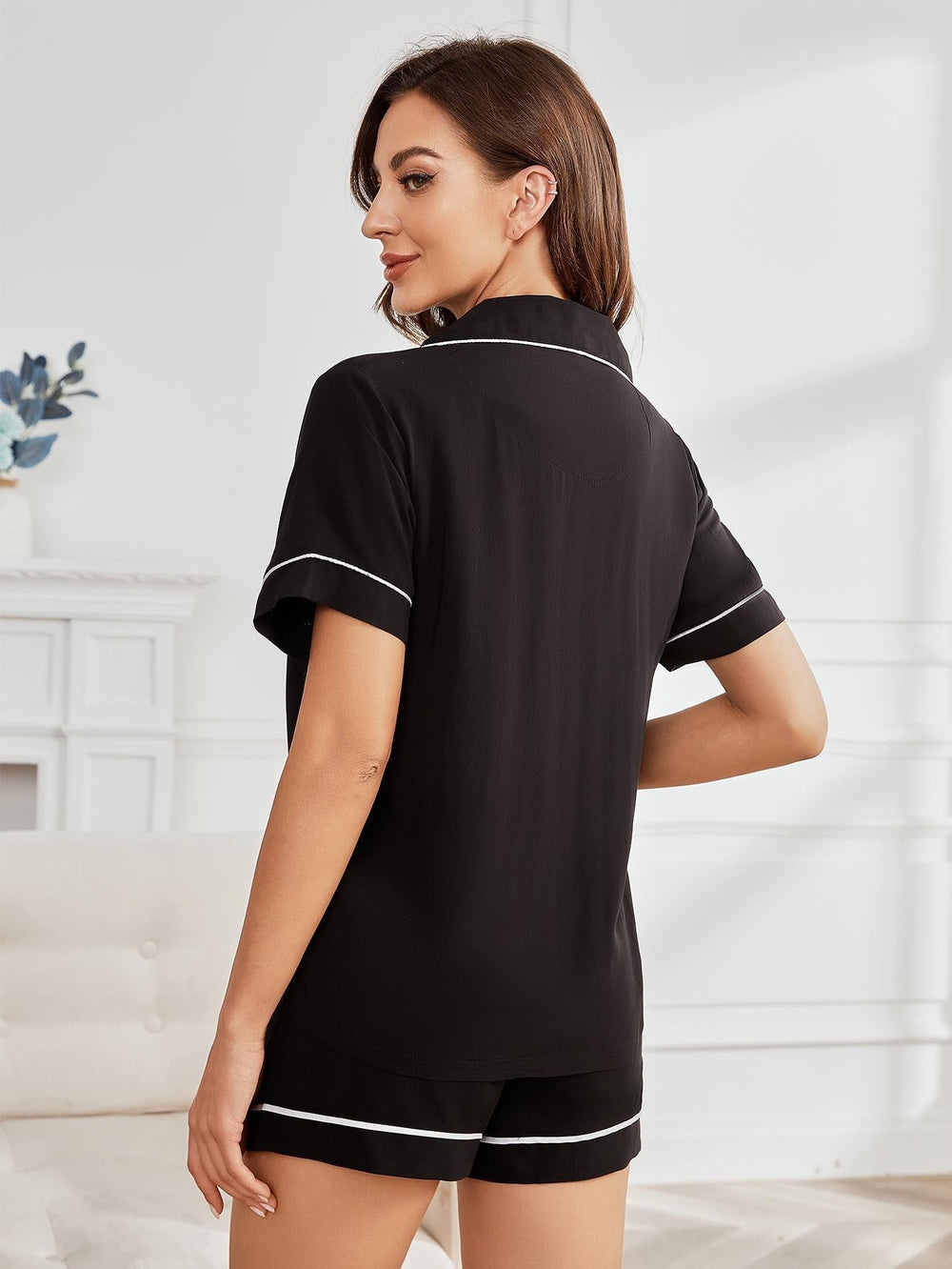 Channel timeless sophistication with our Classic Black Button-Down Pajama Set. Inspired by the effortless elegance of the "Old Money" aesthetic, this two-piece loungewear suit features a sleek black canvas highlighted by crisp white contrast piping. The short-sleeve top boasts a traditional notch collar, a functional chest pocket, and a button-front closure, offering a polished look that bridges the gap between sleepwear and style. Paired with matching relaxed-fit shorts, this set is crafted from a soft, breathable fabric that drapes beautifully, making it the perfect choice for summer nights, bridal parties, or slow weekend mornings.