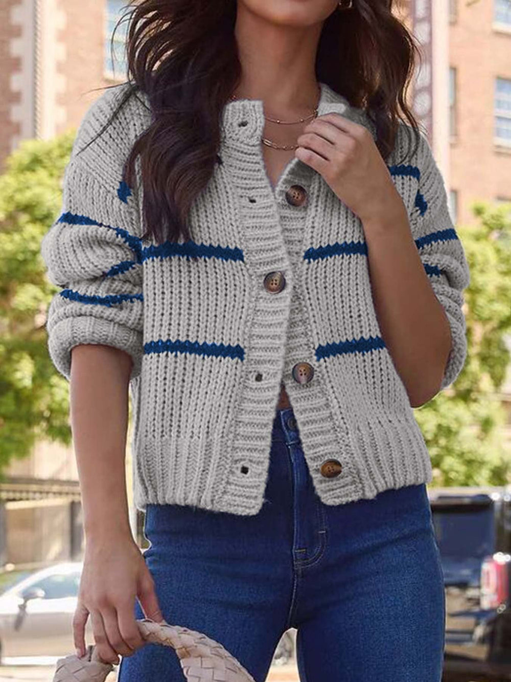 Channel the sophisticated simplicity of the "Old Money" aesthetic with our Classic Striped Crew Neck Cardigan. This versatile piece features a timeless oatmeal-grey base accented with crisp navy blue horizontal stripes, evoking a chic nautical vibe perfect for any season. Whether you are heading to the office or enjoying a weekend brunch, this sweater offers a polished yet relaxed look.