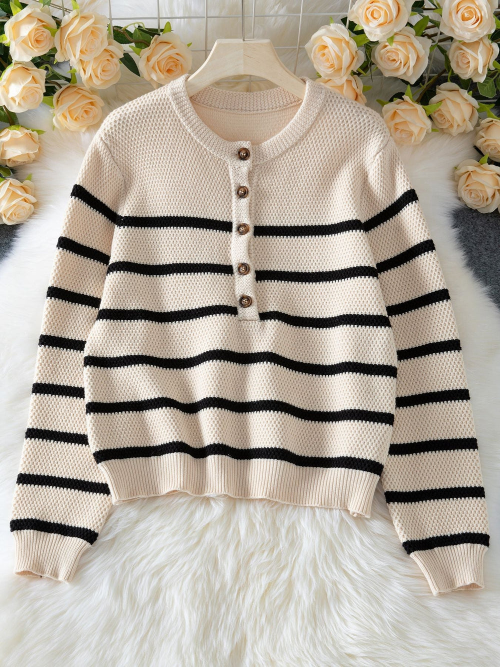 Elevate your weekend wardrobe with our Classic Striped Waffle Knit Henley Sweater. Channeling the effortless sophistication of the "Old Money" aesthetic, this pullover features a timeless cream and black horizontal stripe pattern that never goes out of style. The standout feature is its rich waffle-knit texture (honeycomb), which adds depth, warmth, and a premium hand-feel to the garment.