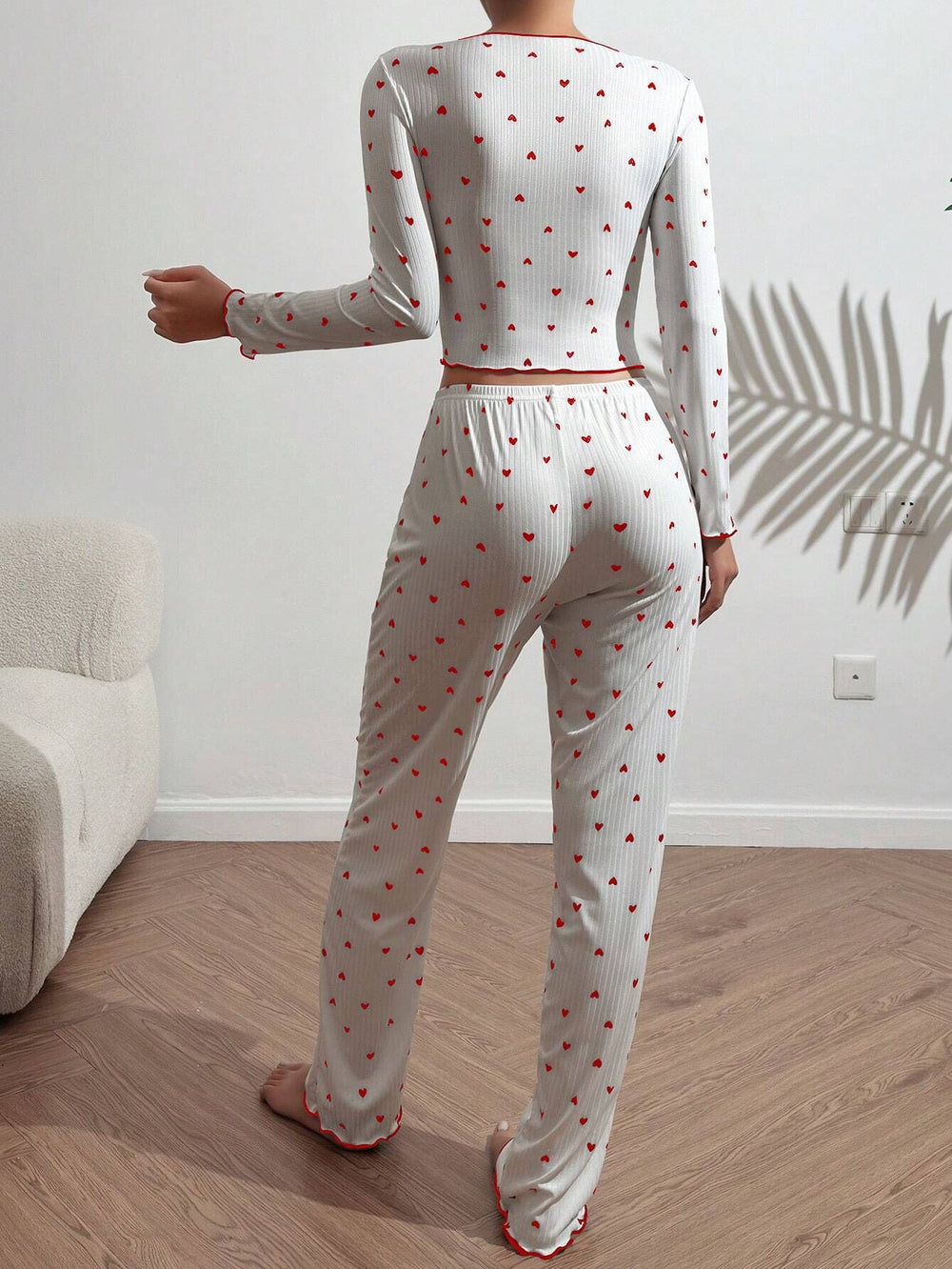 Step into a world of whimsical romance with our Coquette Ditsy Black Heart Print Ribbed Pajama Set. This enchanting two-piece loungewear suit features a pristine white ribbed knit canvas scattered with tiny, delicate black hearts, perfectly capturing the viral "soft girl" aesthetic. The long-sleeve top is designed with a feminine V-neckline adorned with three dainty black satin bows and contrasting black lettuce-edge trim that frames the silhouette beautifully. Paired with matching high-waisted pants that offer a comfortable yet figure-hugging fit, this set is ideal for cozy movie nights, aesthetic sleepovers, or simply feeling cute while you sleep.