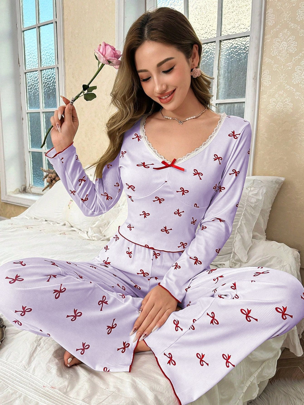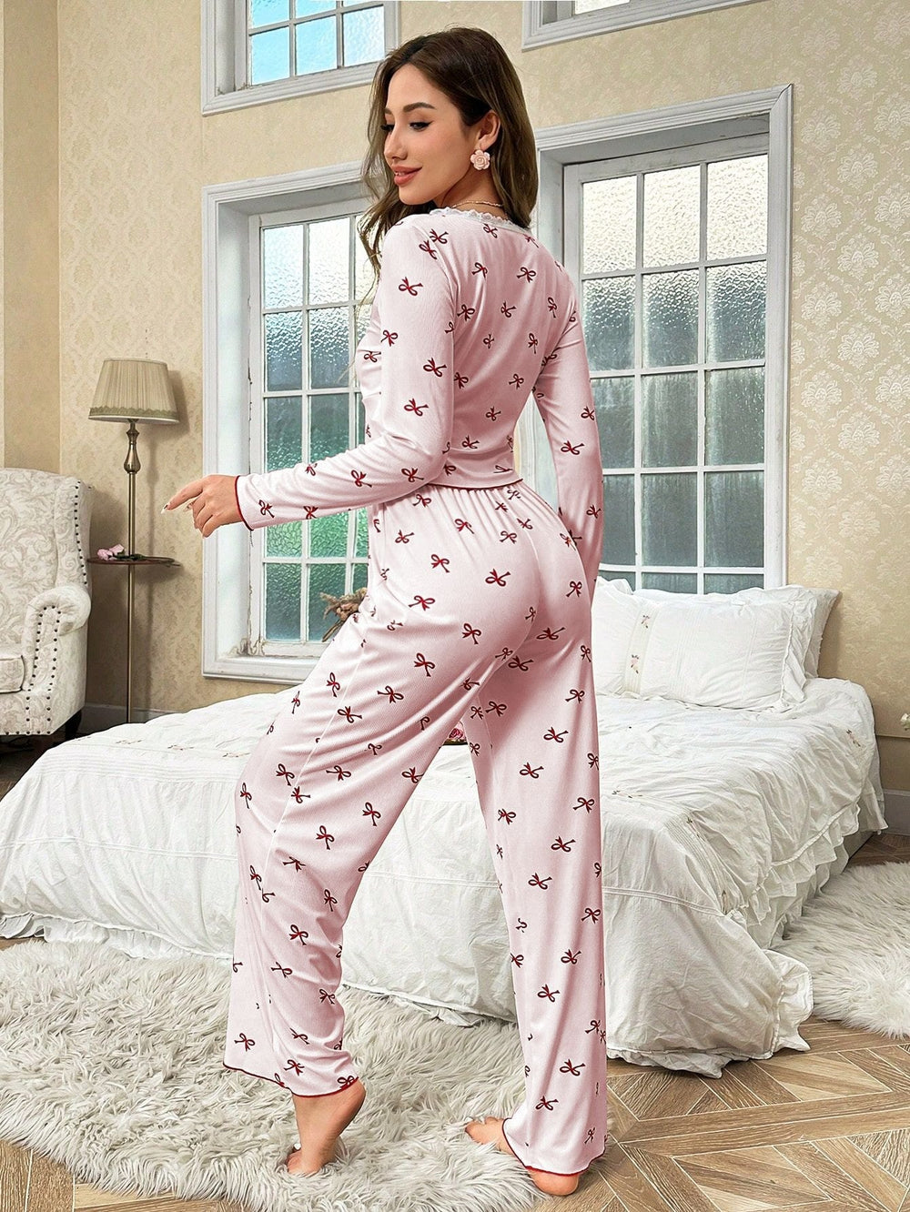 Wrap yourself in the sweet charm of the viral "coquette" aesthetic with our White Bow Print Ribbed Pajama Set. This darling two-piece ensemble features a fresh white ribbed knit canvas sprinkled with dainty red ribbon bows, creating a look that is both innocent and stylish. The long-sleeve top is designed with a feminine V-neckline accented by a mini red satin bow and framed with playful red lettuce-edge trimming. Paired with matching high-waisted pants that offer a comfortable, relaxed fit, this set is the ultimate uniform for aesthetic sleepovers, self-care nights, or dreamy weekend mornings.