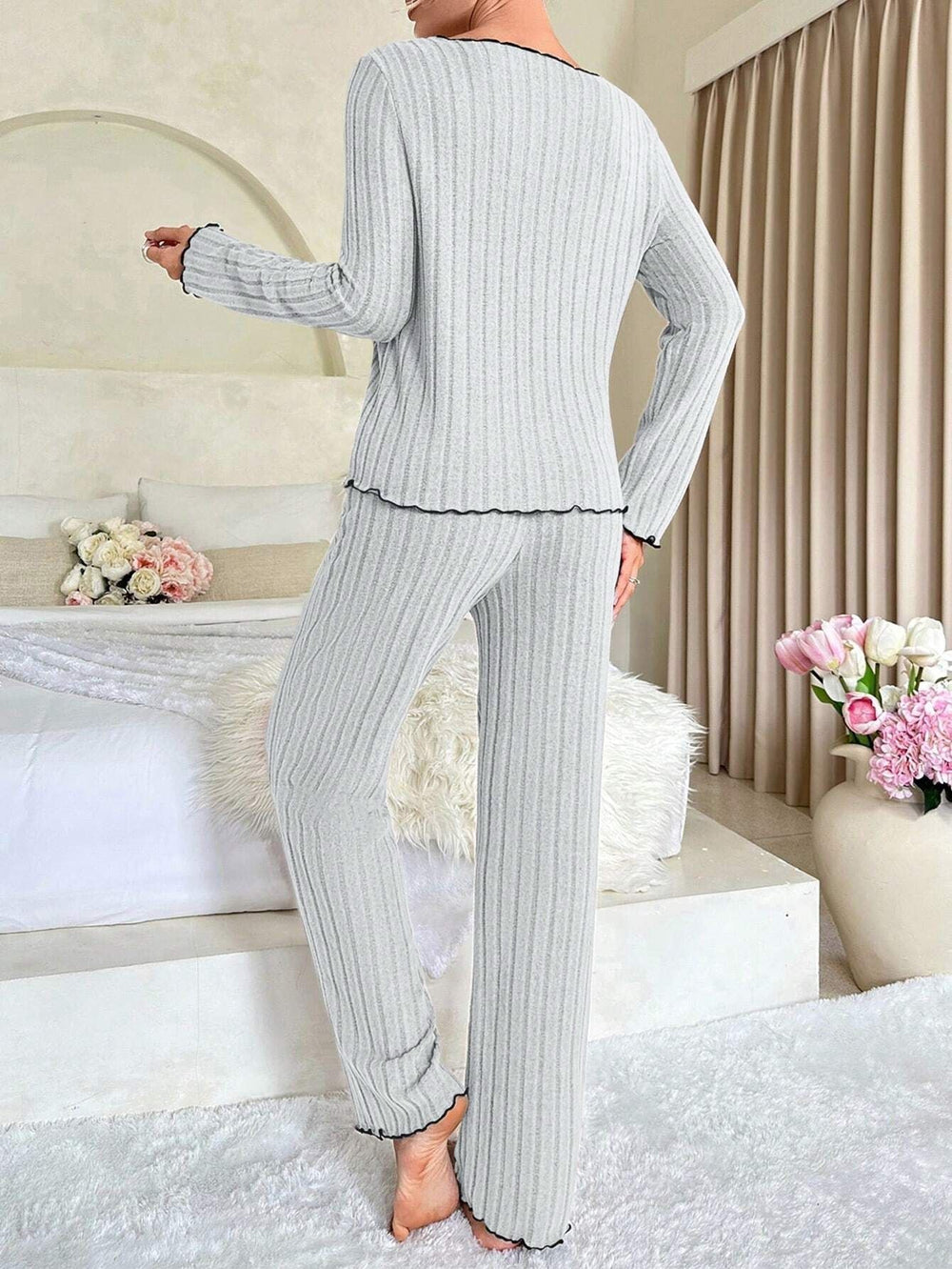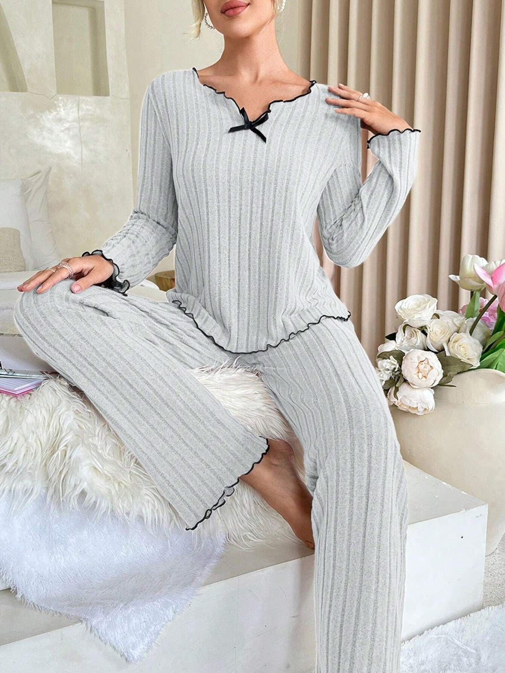 Indulge in the understated elegance of our Coquette Contrast Trim Ribbed Pajama Set. This sophisticated two-piece ensemble features a timeless beige ribbed knit canvas framed by striking black contrast lettuce-edge trim, evoking a classic "Old Money" or Parisian chic aesthetic. The long-sleeve top is accented with a delicate black satin bow at the V-neckline, adding a touch of sweet romance. Paired with matching relaxed-fit trousers, this set is crafted from a substantial, high-quality fabric blend that offers warmth and a soft, cozy drape perfectly suited for autumn and winter lounging.