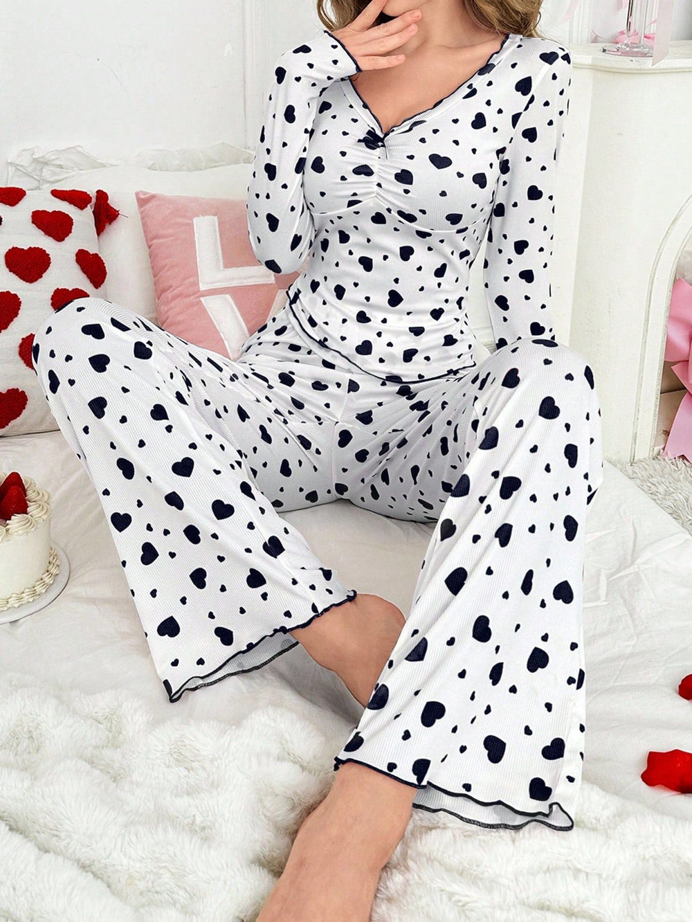 Fall in love with your loungewear collection all over again with our Coquette Heart Print Ribbed Pajama Set. This darling two-piece ensemble features a romantic all-over red heart print on a soft, white ribbed knit canvas. The top is designed with a flattering V-neckline and a gathered, ruched bust that enhances your silhouette, finished with a dainty red satin bow. Playful red lettuce-edge trimming along the hems and cuffs adds a whimsical, vintage-inspired touch. Whether for a cozy Valentine's night or sweet dreams year-round, this set blends comfort with undeniable cuteness.