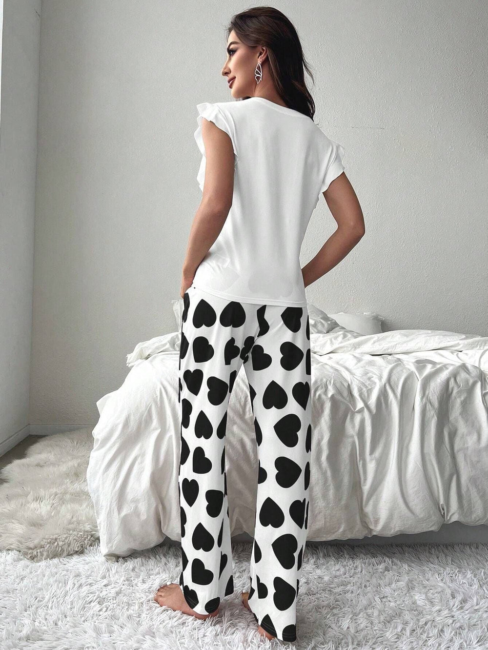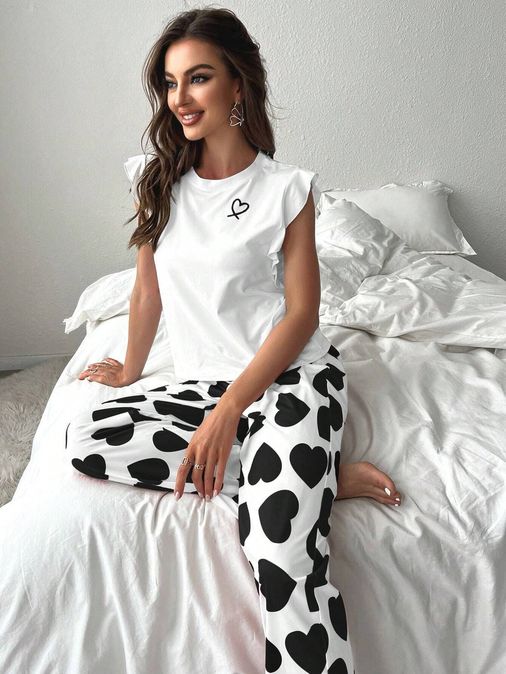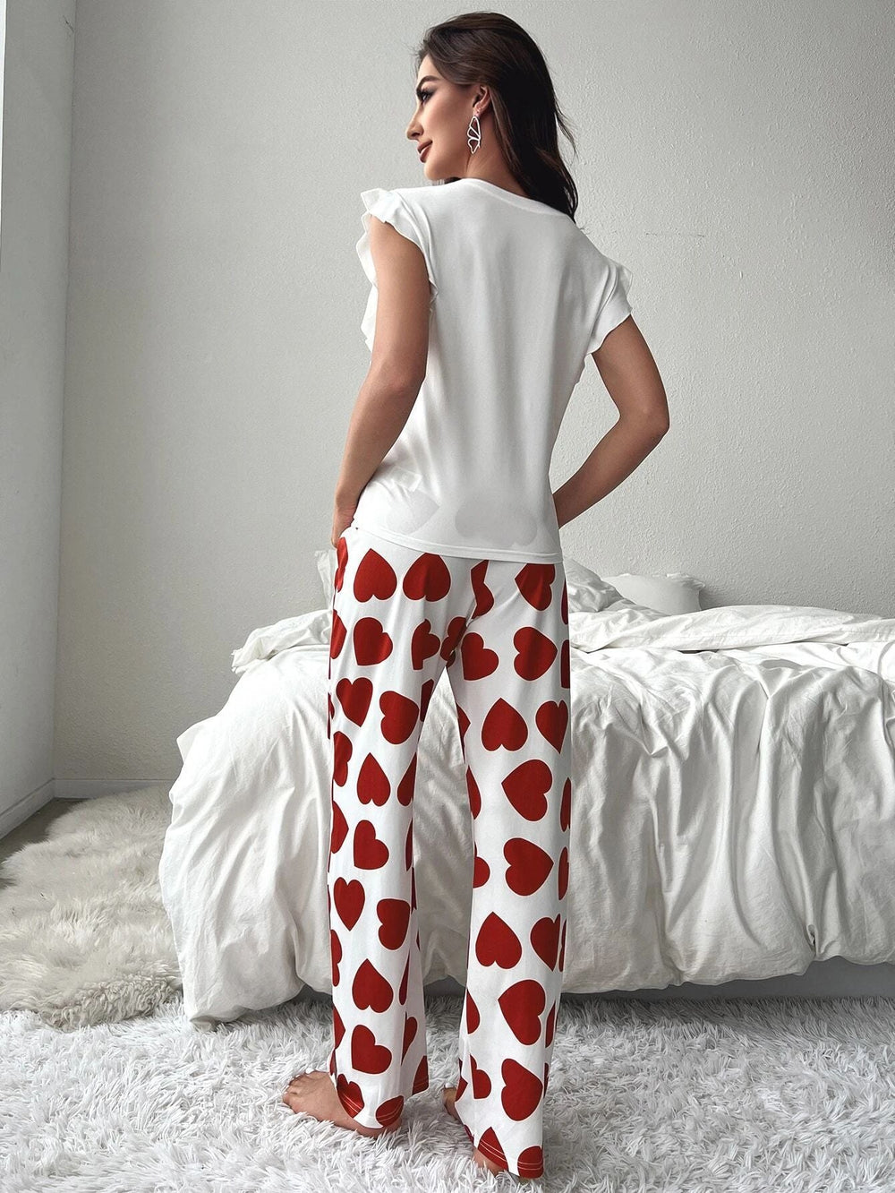 Fall in love with the sweet simplicity of our Coquette Pink Heart Print Ruffle Sleeve Pajama Set. This charming two-piece ensemble captures the essence of the "soft girl" aesthetic with a pristine white canvas highlighted by romantic pink accents. The top features playful flutter sleeves (ruffled cap sleeves) that add a touch of whimsy and a delicate embroidered heart on the chest. Paired with matching relaxed-fit trousers adorned with a bold, all-over large pink heart pattern, this set balances cute style with ultimate comfort. Crafted from a soft, breathable blend, it's perfect for warm nights, aesthetic morning routines, or lounging in style.