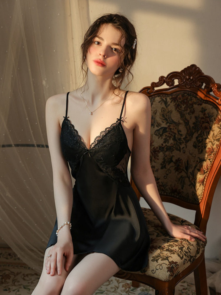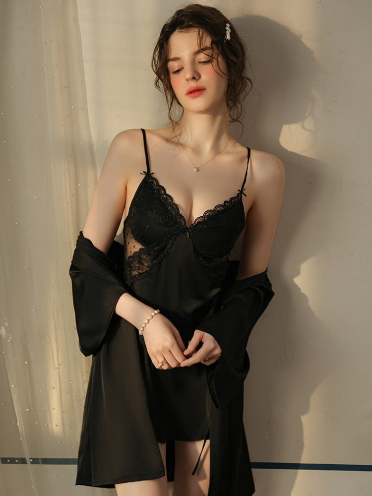 The slip dress features a sweet "Princess Style" V-neckline adorned with embroidered floral lace. The bodice transitions into semi-transparent dot mesh panels at the sides and back, creating a look that is innocent yet alluring. The back reveals a delicate open design with a horizontal strap, perfectly balancing coverage and exposure. Wrapped in the matching silky robe, you'll feel like royalty in your own boudoir.