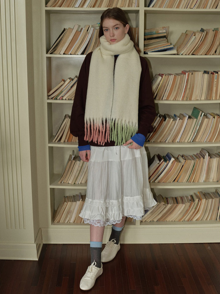 Stand out from the crowd with this "Super Special" edition scarf. The pristine cream body transitions into playful, dip-dyed tassels in contrasting pink and green hues, creating a stunning visual effect reminiscent of watercolor paintings. Perfect for the creative soul or the "Soft Girl" looking for a unique signature piece. It adds an unexpected twist to classic wool coats and chunky knits.