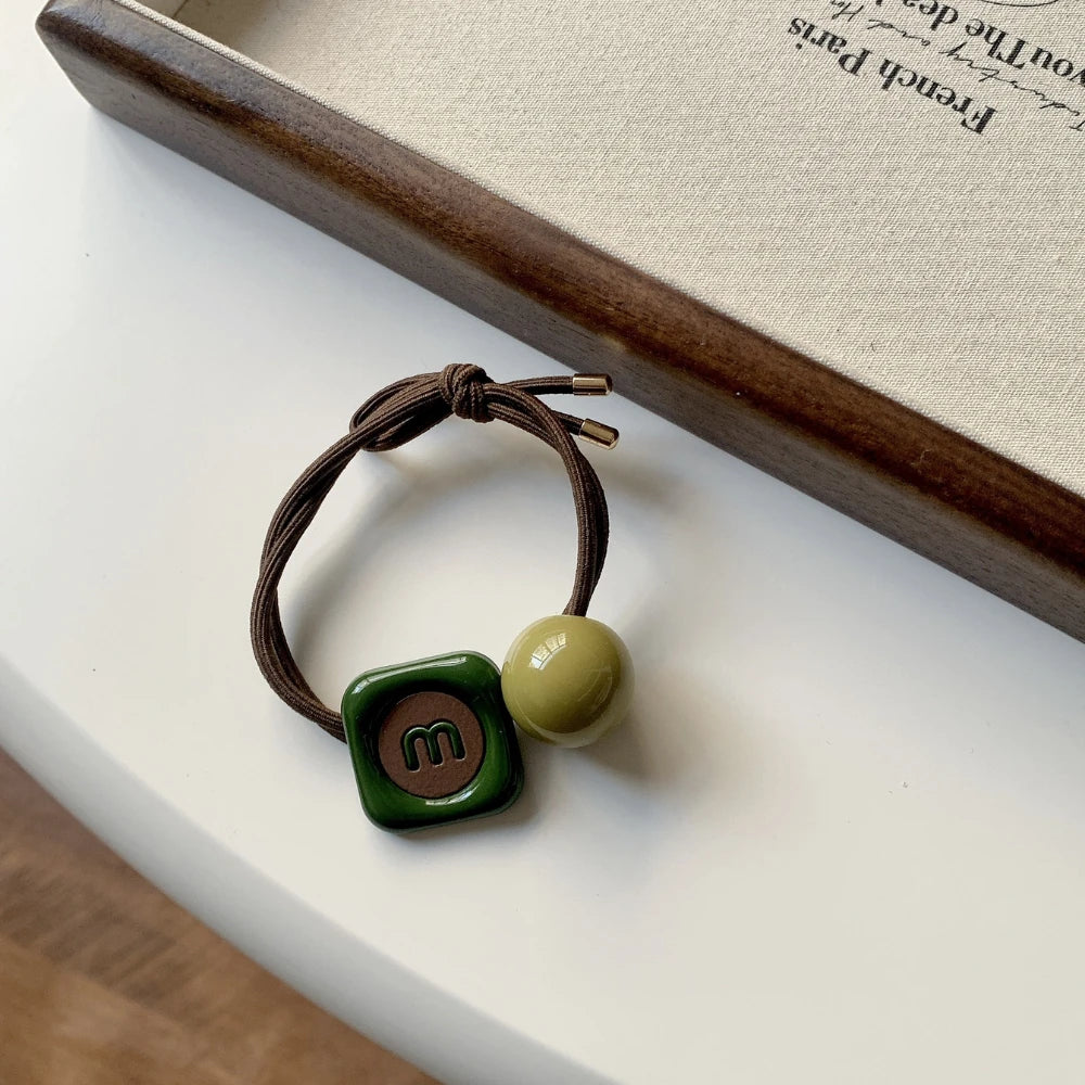 Elevate your everyday ponytail with a touch of playful, retro charm. This isn't just a hair tie—it's a curated accessory. Designed in the season's trendiest "Maillard" (earthy green) tones, this piece features a durable, double-strand elastic for an extra-secure hold. It's adorned with a set of chic, glossy acrylic beads and a central charm (your choice of a retro smiley, a cute doggy, or a preppy initial). At only 11g, it’s the perfect, lightweight way to add a pop of personality to your look without any of the pull.