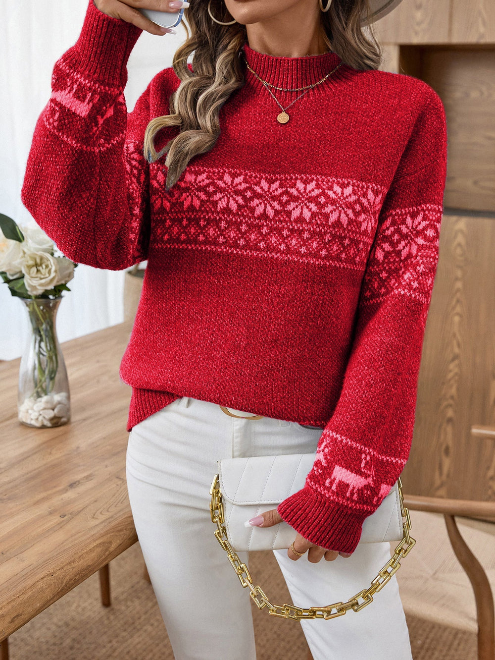 Capture the nostalgic magic of the holiday season with our Festive Nordic Snowflake Mock Neck Sweater. Inspired by classic "Apres-Ski" style, this cozy pullover features a timeless Fair Isle pattern adorned with delicate snowflakes and charming reindeer silhouettes. The soft blue hue mirrors a crisp winter sky, making it a dreamy addition to your seasonal wardrobe.