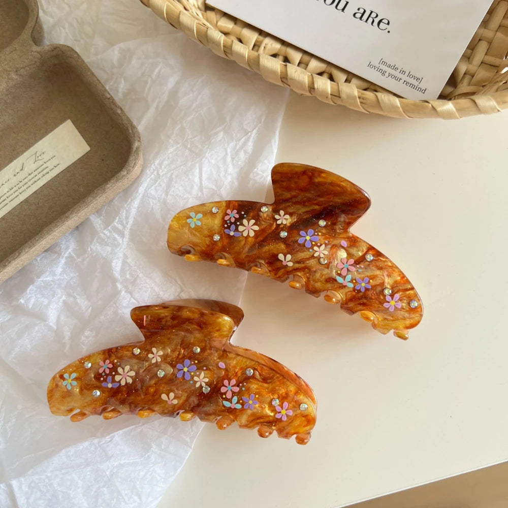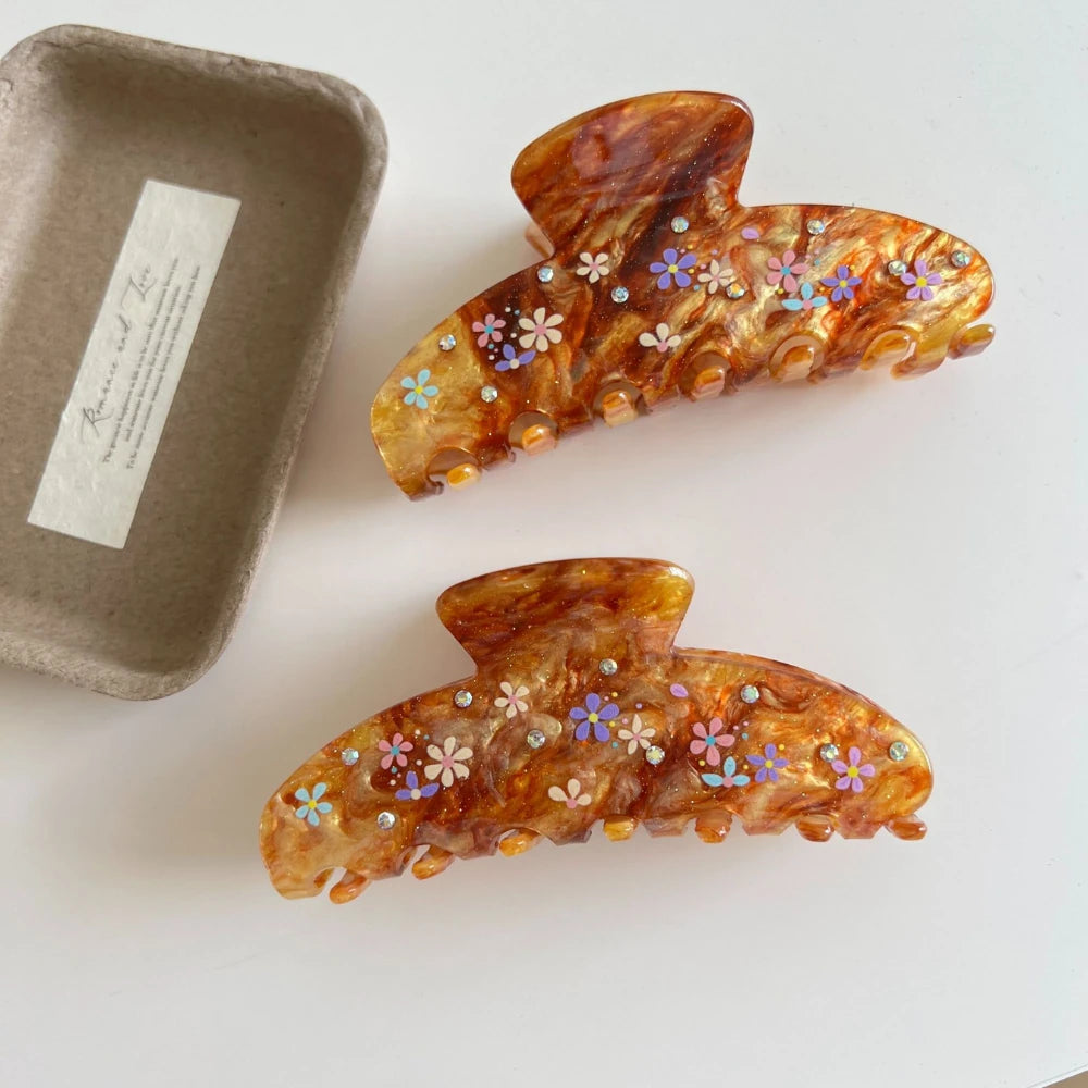 Crafted from premium, plant-based cellulose acetate, this clip features a rich, translucent "Amber" base that glows in the light. It's meticulously adorned with delicate, multi-colored inlaid flowers and tiny, sparkling rhinestones. Its 4-inch (10cm) size and strong metal spring provide a secure, all-day hold for medium-to-thick hair, while the polished, rounded teeth grip without ever snagging or pulling. It's the perfect, whimsical touch for a garden party or just elevating your everyday look.