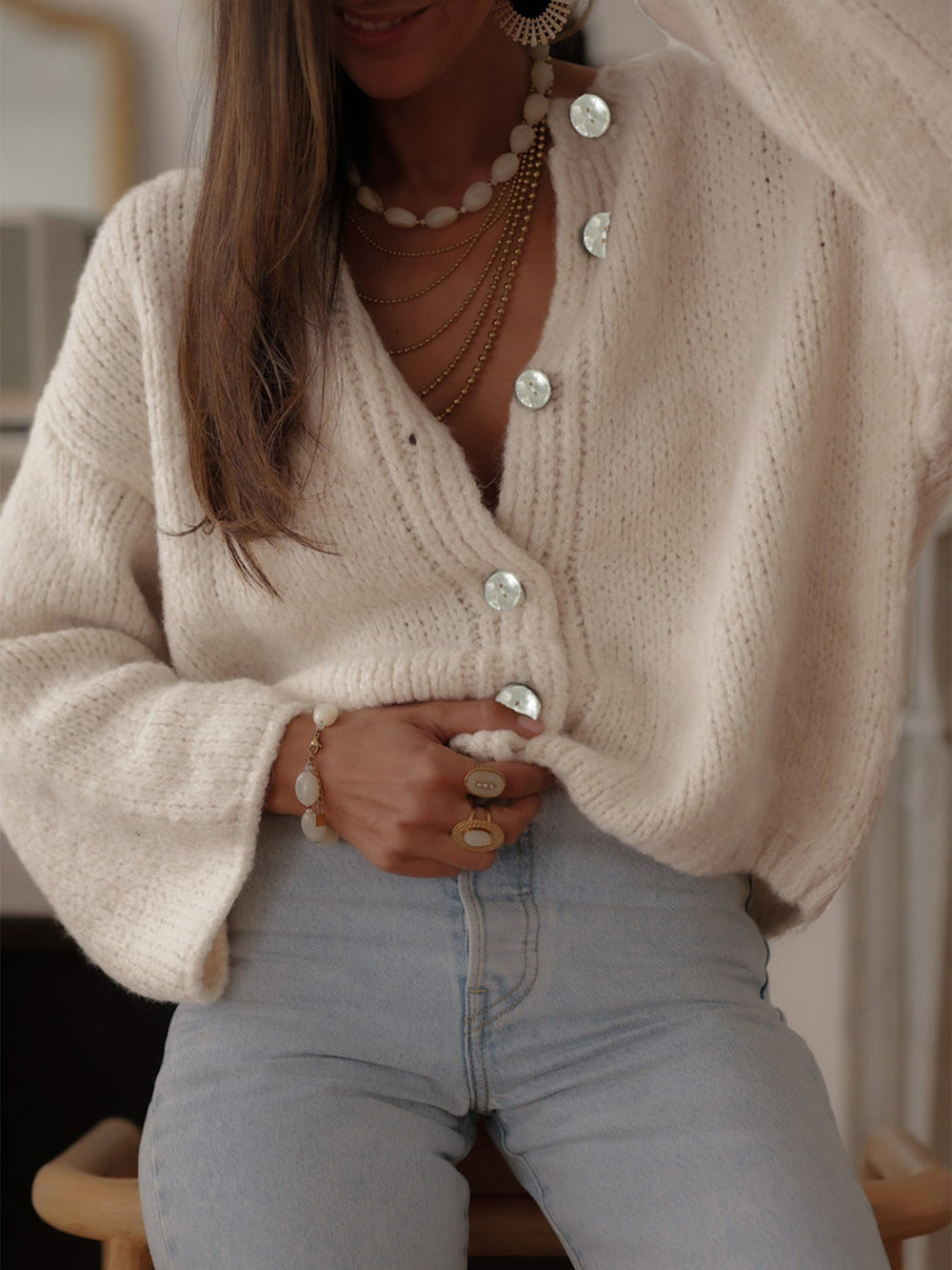 Capture the romantic essence of French street style with our French Chic Pearl Button Cardigan. Designed to offer that coveted "je ne sais quoi," this sweater features a relaxed, slouchy silhouette paired with voluminous lantern sleeves that drape beautifully around the wrists. The soft oatmeal hue acts as a neutral canvas, allowing the oversized, pearlescent buttons to shine as the jewelry of the garment.