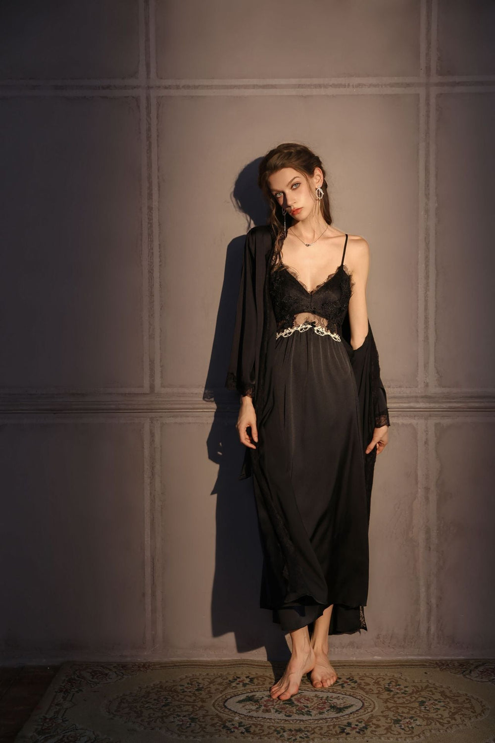 The bodice is adorned with intricate, ethereal lace that frames the décolletage, offering a glimpse of vintage charm. Crafted from high-grade "Ice Silk" satin, it drapes effortlessly over your curves, providing a cooling, water-like sensation against the skin. With a daring low back featuring delicate crisscross straps and the convenience of built-in padding, this slip dress is perfect for languid mornings, romantic evenings, or simply feeling like art within your own home.