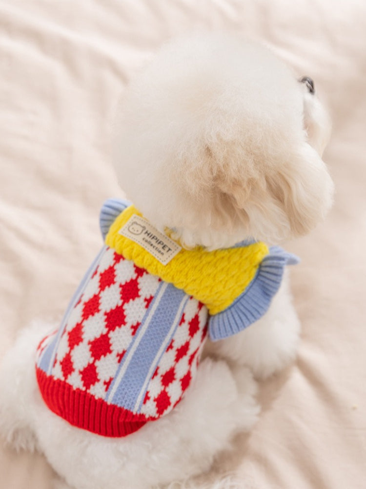 Brighten up your pet's wardrobe with this charming Argyle Knit Dog Sweater. Featuring a preppy color-block design in fresh green and yellow, this pullover is distinguished by its playful ruffled "flying" sleeves and classic diamond pattern. The textured knit yoke adds extra warmth and style, making it a perfect choice for Bichons, Teddies, and other small breeds during the cooler months.