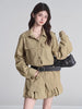 This two-piece utility set features a structured button-up shirt and a matching bubble hem mini skirt. Designed with a functional cargo aesthetic, it includes a grommet belt to cinch the waist for a defined silhouette.