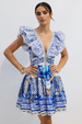 Ruffle Shoulders, Deep V-neck, Floral Print, Open back, Cap sleeves, Mini Length.