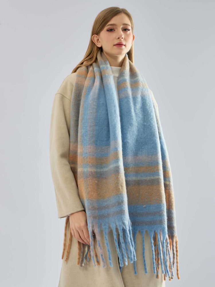 Elevate your cold-weather layers with this extra-long plaid scarf. Featuring a soft blend of blue, beige, and neutral tones in a classic check pattern, this accessory is designed for versatility. The generous 96-inch length allows for multiple wrapping styles, while the soft texture provides cozy warmth without bulk.