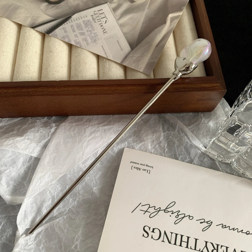 The pin is topped with a single, delicate rose, carved from an opalescent stone that beautifully catches the light. It's the ultimate "Clean Girl" accessory, perfect for the office, a wedding, or an elegant everyday look.