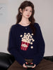 Infuse your wardrobe with a playful touch using this Navy Blue Popcorn Graphic Knit Sweater. The centerpiece of this cozy pullover is a whimsical popcorn bucket design featuring 3D textured tufting that mimics real popcorn spilling out. It is the perfect statement piece for a fun, casual look.