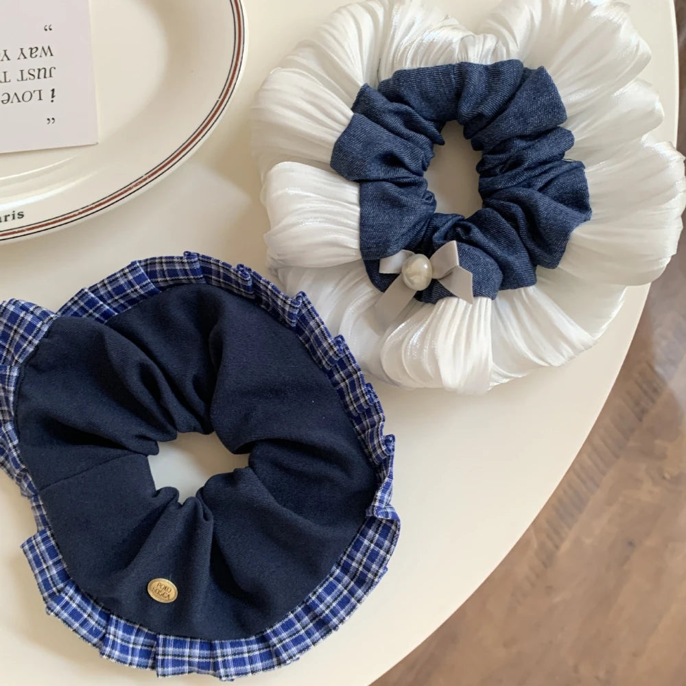 Embrace timeless, preppy charm with an airy, lightweight feel. This oversized scrunchie is a masterpiece of mixed textures, designed to add a touch of effortless sophistication to your look. At a massive 6.3 inches, it creates a full, statement look, yet at only 19 grams, it's featherlight—providing a strong, all-day hold that won't pull or snag. Choose from classic navy & plaid or an elegant white satin & denim.