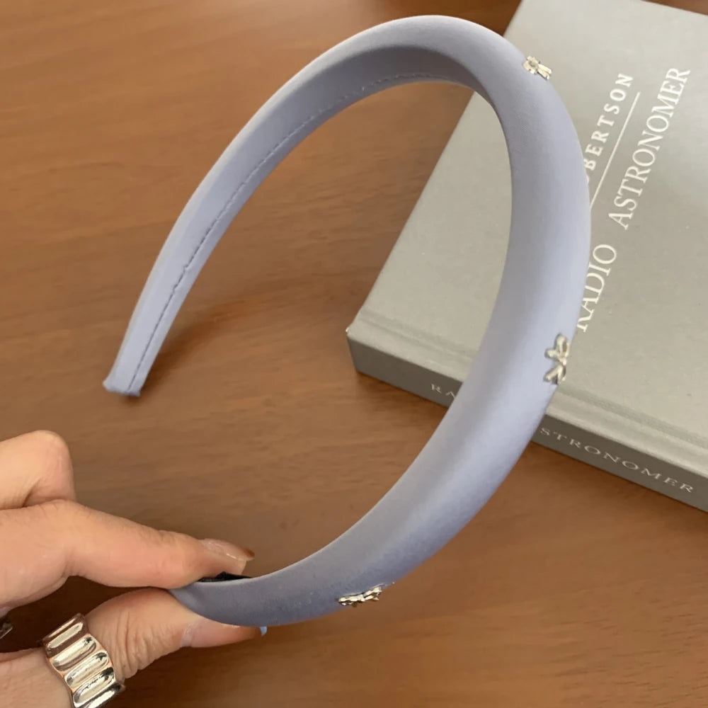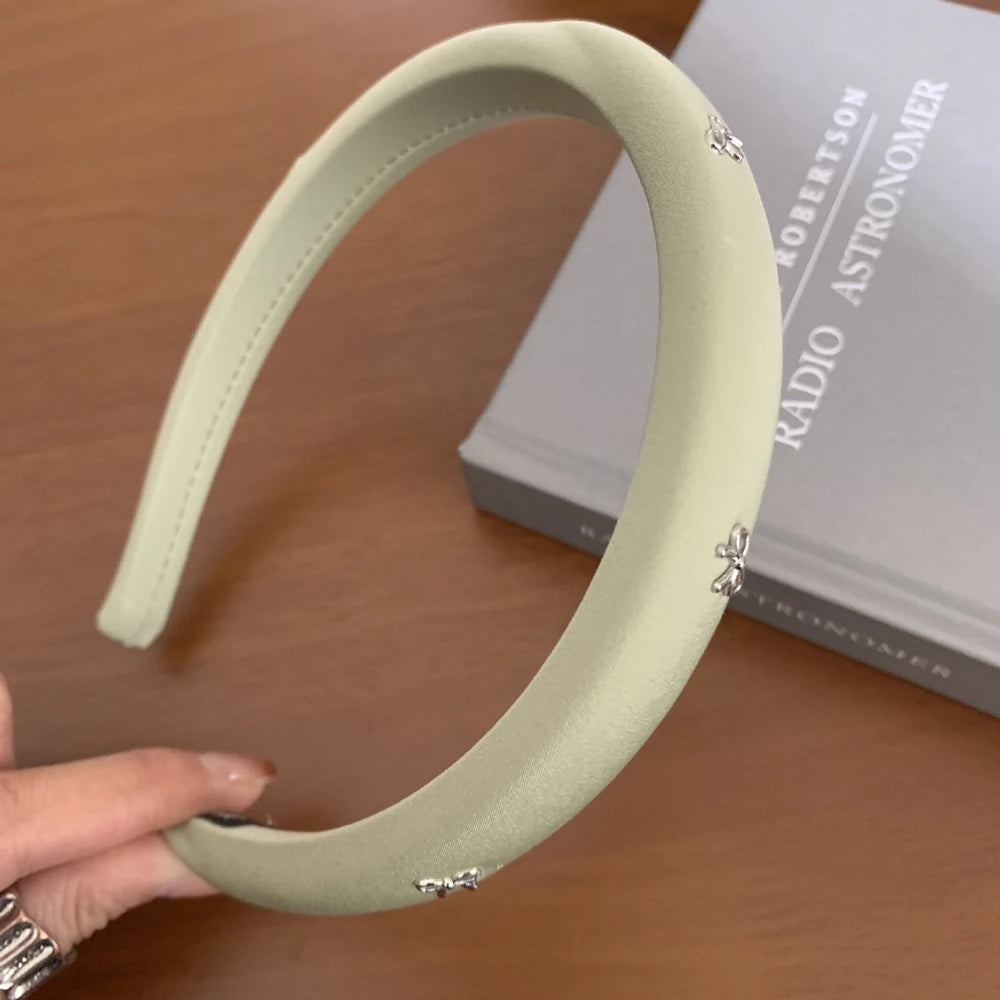 Crafted with a soft, matte fabric overlay, this headband features subtle padding (0.6-inch / 1.5cm width) for a gentle lift and flattering volume. It's adorned with dainty, polished silver-tone bow charms, evenly spaced for a delicate, boutique feel.