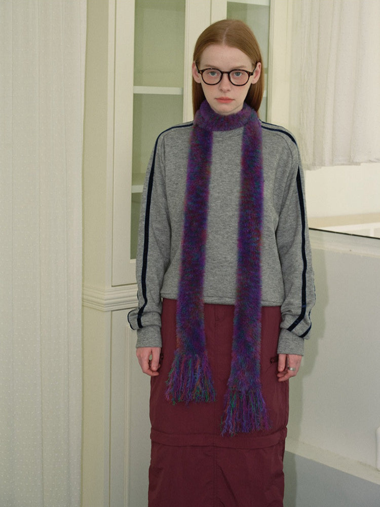 Embrace the sweet "Soft Girl" energy with this adorable pink skinny scarf. The space-dye yarn creates a gentle gradient of strawberry milk pink and soft white, mimicking the dreamy vibes of early 2000s fashion. Styled with a grey sweatshirt and knee-high socks, it adds a playful, texture-rich focal point to any casual outfit. It’s the perfect "dopamine" accessory for gloomy winter days.