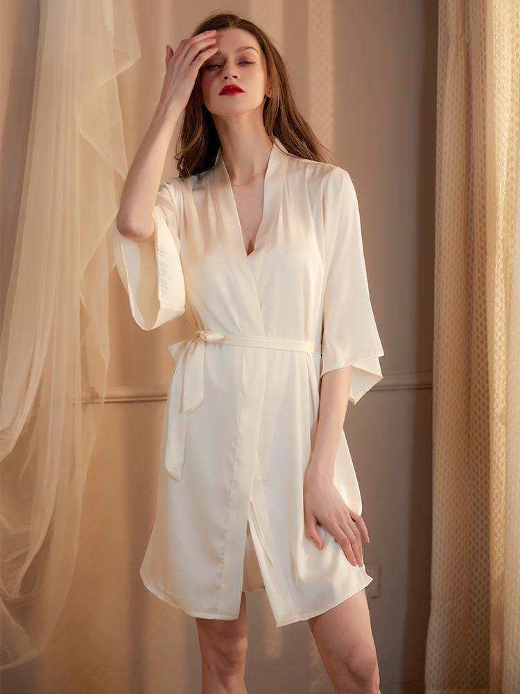 The slip dress is designed with a provocative twist-knot front cutout, creating a tasteful "hollow out" effect that highlights your silhouette. The drama continues at the back with a plunging open design, secured by delicate crisscross spaghetti straps. Paired with a matching silky robe, this set is the epitome of luxurious relaxation and "pure desire".