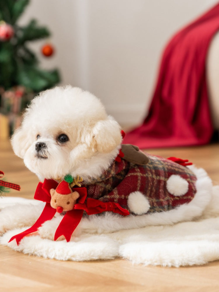 Make this holiday season unforgettable with this exquisite Red Plaid Christmas Pet Cape. Designed to turn heads at holiday parties, this hooded cloak features a classic red tartan pattern trimmed with snowy white faux fur. Adorned with a large red bow and a cute 3D reindeer plush, it is the perfect outfit for Christmas cards and festive winter walks.