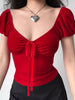 Make a bold statement with this luxurious red velvet top. Combining a rich texture with a romantic vintage silhouette, this piece features a flattering deep V-neckline, adjustable tie-front detailing, and charming puff sleeves. The soft stretch velvet fabric provides a body-hugging slim fit that is both comfortable and striking, perfect for evening outings or adding a touch of drama to your daily style.