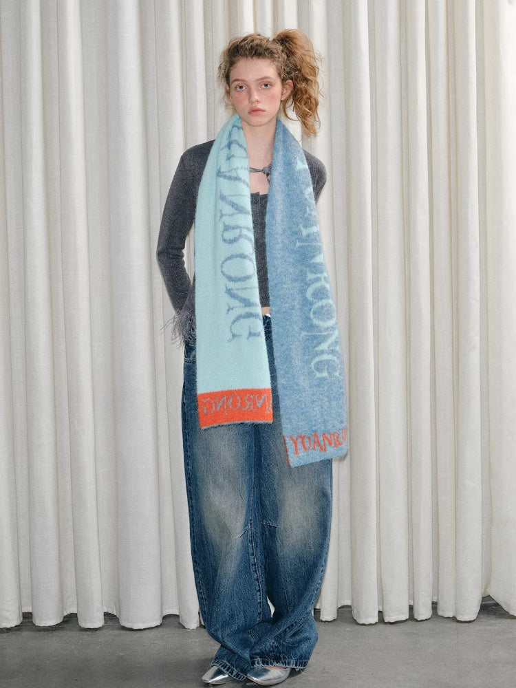 Make a statement this winter with this reversible knit scarf featuring bold, jacquard-woven lettering. Designed with a dual-sided colorway in shades of blue and light blue, it offers versatile styling options. The scarf is finished with contrasting orange borders at the ends for a pop of color. Crafted from a soft wool blend, it provides essential warmth and a comfortable, non-itchy feel suitable for daily wear.