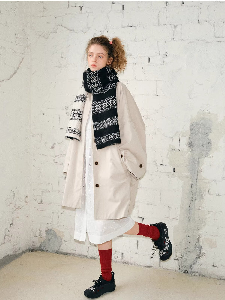 Elevate your winter aesthetic with this vintage-inspired knit scarf. Featuring a classic Nordic snowflake pattern, this accessory is double-faced, offering a reversible design that switches between black and white dominants for versatile styling. Crafted from a soft yarn blend containing 7% sheep wool, it provides enhanced warmth and a cozy feel.