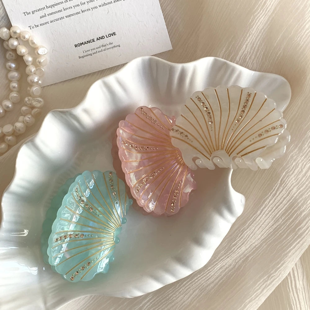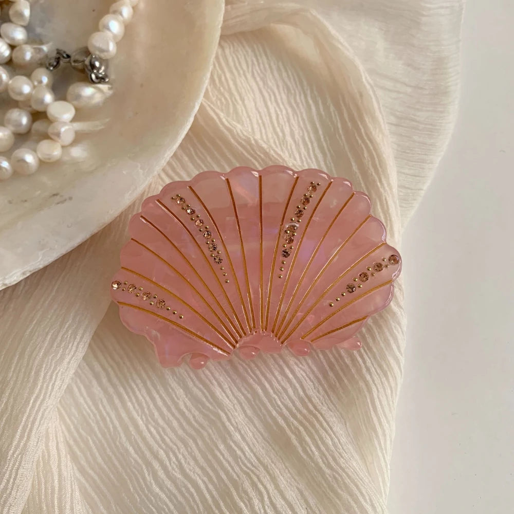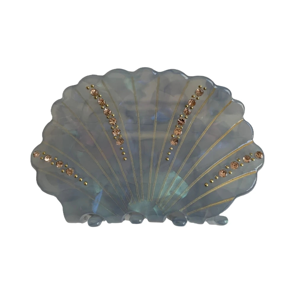 Capture the magic of the coastline with this exquisite seashell hair clip. Crafted from premium, pearlescent cellulose acetate, each clip shimmers with an oceanic glow. Delicate lines of sparkling mini-rhinestones trace the shell's natural ridges, adding a touch of glamour to this beach-inspired piece. At 2.5 inches (6.5cm), it's the perfect elegant accent for a half-up style, a sophisticated bun, or a coastal-themed wedding.