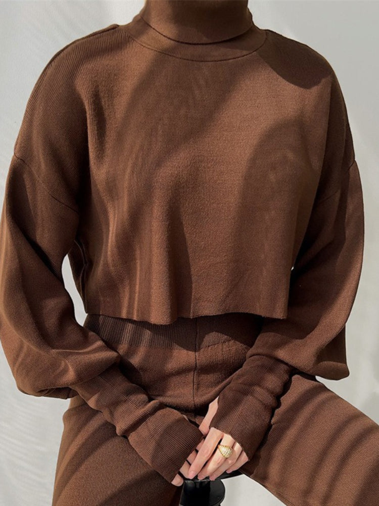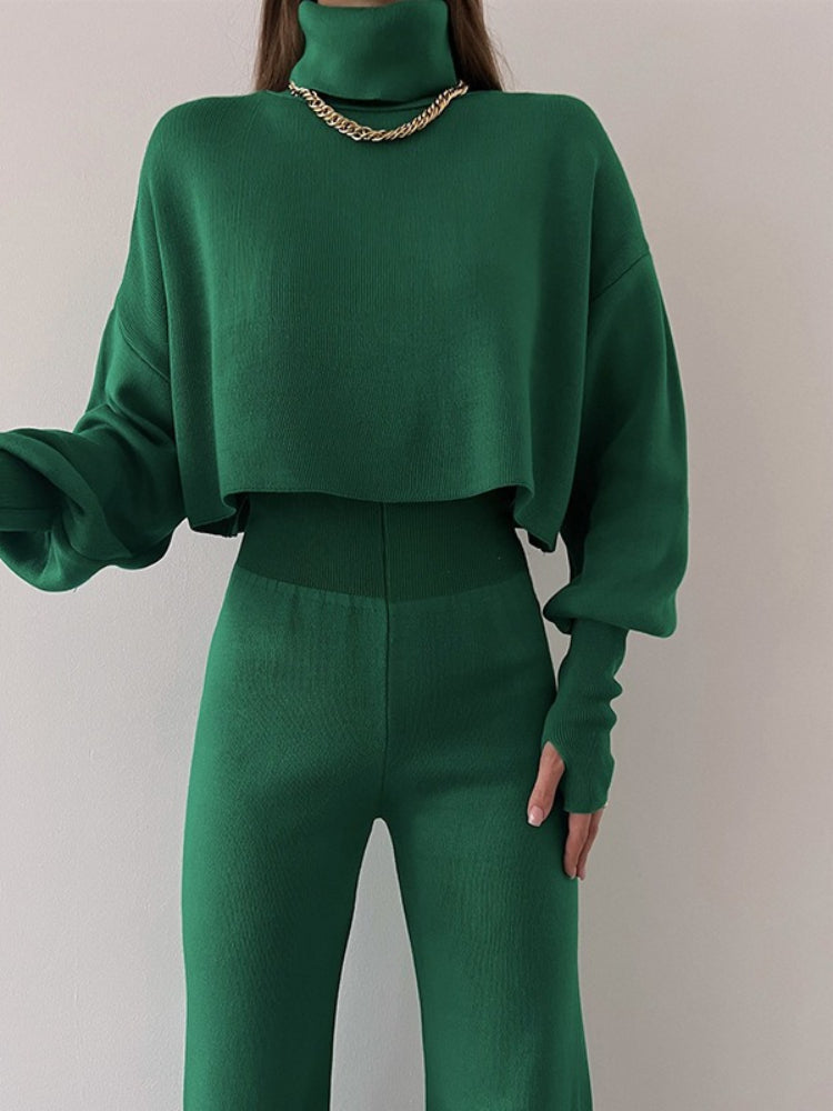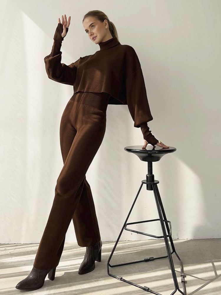 The top features a sophisticated high turtleneck and dramatic lantern sleeves, creating a silhouette that is both romantic and empowering. Paired with high-waisted, flowy wide-leg trousers, this ensemble elongates your figure while wrapping you in breathable, soft-touch fabric. It’s the "Old Money" casual look you’ve been searching for.